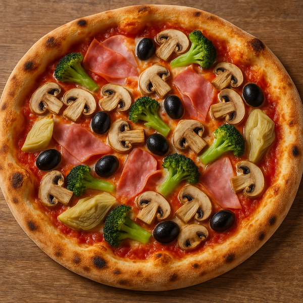 Diese Pizza überzeugt durch ihre perfekte Balance zwischen mild, würzig und frisch. Der herzhafte Schinken sorgt für einen kräftigen Akzent, während die Champignons eine angenehme Erdigkeit einbringen. Die Oliven verleihen der Pizza mediterrane Tiefe, die Artischocken eine elegante, feine Note, und der Brokkoli rundet das Ganze mit einer frischen Leichtigkeit ab. So entsteht eine Pizza, die abwechslungsreich, ausgewogen und einfach köstlich ist.